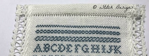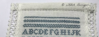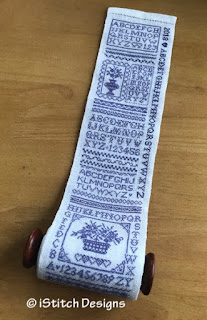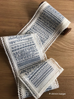 iStitch Designs - Blue Band Sampler Part 1 - this design was the first part of the Blue Band Sampler SAL and is now released for general sale. It is stitched on a pretty lace-edged banding with a lovely shade of blue silk thread. There is a Part 2 to this design to be released after the SAL finishes. If you are interested in purchasing this design go