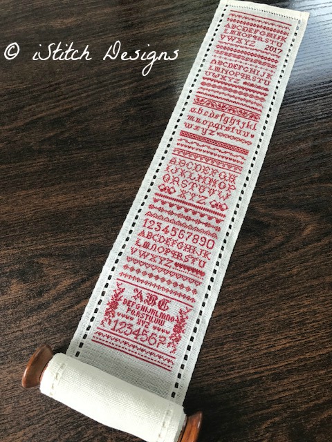 iStitch Designs Red Band Sampler - originally sold as a SAL and is now released for general sale. It is stitched 1 over 1 on a pretty hole-edged banding (28ct) with Gloriana Schoolhouse Red. This is sold in two parts - 1 and 2 - the stitch count for each part is 73 x 410 plus a bonus chart. It can, of course be stitched in any colour on any type of fabric.